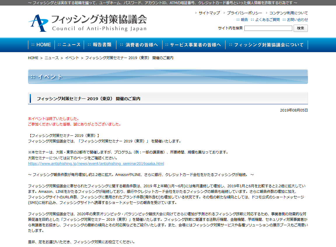 フィッシング対策協議会では、昨今急増しているフィッシング詐欺に対応するため、効果的な対策促進や啓発を目的とした「フィッシング対策セミナー」や「フィッシング対策勉強会」を開催しています。