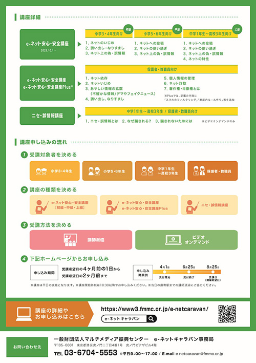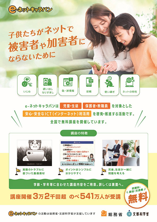 児童・生徒(小学3年生~高校3年生)を受講対象とした『e-ネット安心・安全講座(初級~上級、学年による)』、保護者・教職員を受講対象とした『e-ネット安心・安全講座Plus』、および中学生以上を受講対象とした『ニセ・誤情報講座』により、ICT(インターネット)利活用において被害者や加害者とならないために必要な気づきを与える事を目的とします。