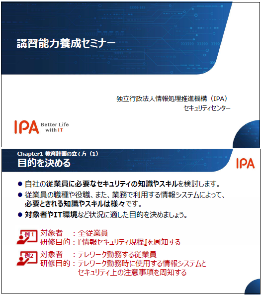 中小企業の教育担当者や情報セキュリティに関するセミナーを開催する方を対象に効果的な教育・研修を実施するための能力養成を目的としたセミナーです。