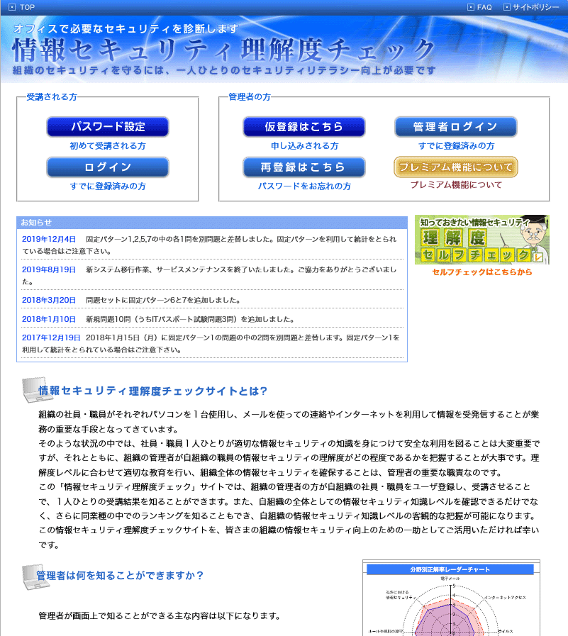 この情報セキュリティ理解度チェックサイトを、皆さまの組織の情報セキュリティ向上のための一助としてご活用いただければ幸いです。