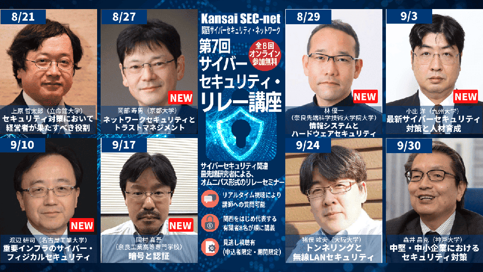 ・関西地域を中心に、日本を代表するセキュリティ研究者によるリレー講座です。セキュリティの一つの分野を深めるのではなく、幅広くそのエッセンスを学びます。