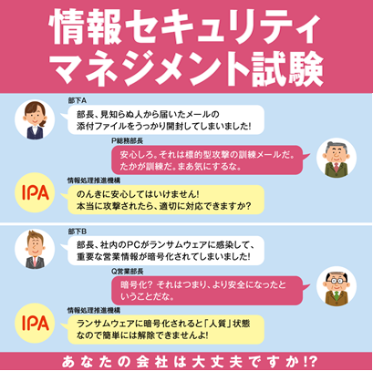 情報セキュリティマネジメント試験は、情報セキュリティマネジメントの計画・運用・評価・改善を通して組織の情報セキュリティ確保に貢献し、脅威から継続的に組織を守るための基本的なスキルを認定する試験です。