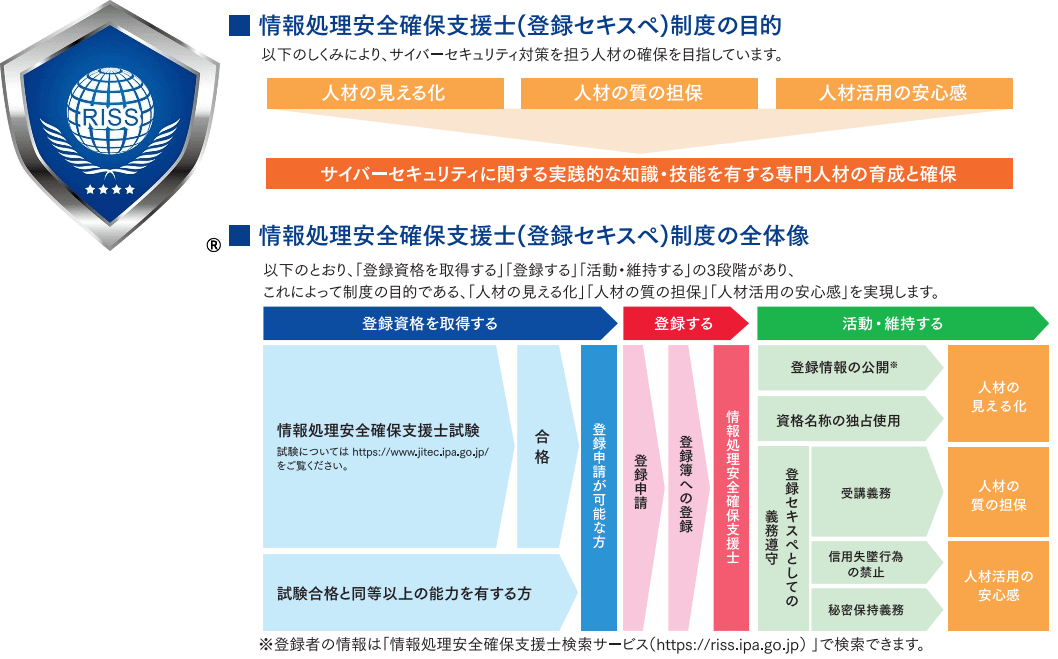 - 情報処理安全確保支援士(登録セキスペ)とはサイバーセキュリティ対策を推進する人材の国家資格です。