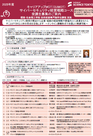 本格的なグローバルネットワーク社会の到来に伴い、サイバーセキュリティに関連する事業リスク管理・危機管理の実践が企業・組織の持続性と価値向上に重要な意味を持ち、経営判断や戦略構築に大きな影響を及ぼし始めています。この情勢を受けて、本コースではサイバーセキュリティ経営及びその戦略立案に求められる知識・能力を備え、企業・組織を先導する人材の育成を目的とします。