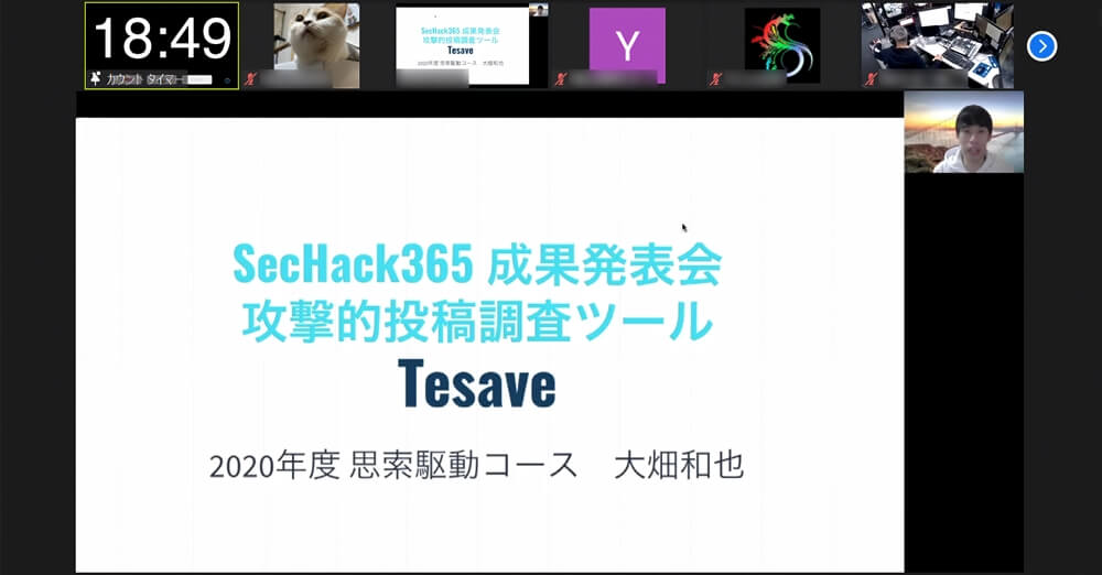 SecHack365は自身のアイディア、実装力、行動力で何か新しいことをやってみたいと考える意欲ある若者に最適なプログラムだと私は考えます。なぜなら、本プログラムはその気持ちを支えるために十分な環境を受講者に提供するからです。自分ひとりで行う開発では、製作途中で開発へのモチベーションが続かなくなってしまうことや、製作物に対して他の人から意見をもらえる場が少ないことも考えられますが、SecHack365ではその心配をするは必要ありません。他の受講者の頑張る姿からエネルギーを得ることができ、発表の場では自身の作品に対してたくさんの意見を受け取ることができます。何か漠然とでもアイディアを形にしたいと考えている方は、ぜひ応募を検討してみてください。