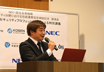 NECでは2022年7月に国立高専機構様とサイバーセキュリティ分野における包括連携協定を締結し、実践力を有する人材の育成・輩出を目指した活動を行っております。具体的には、NECが持つ研修・教育教材を用いた実践的な講義の実施、先生方とNECの専門技術者との情報交換などによる最新動向の共有などを行っております。