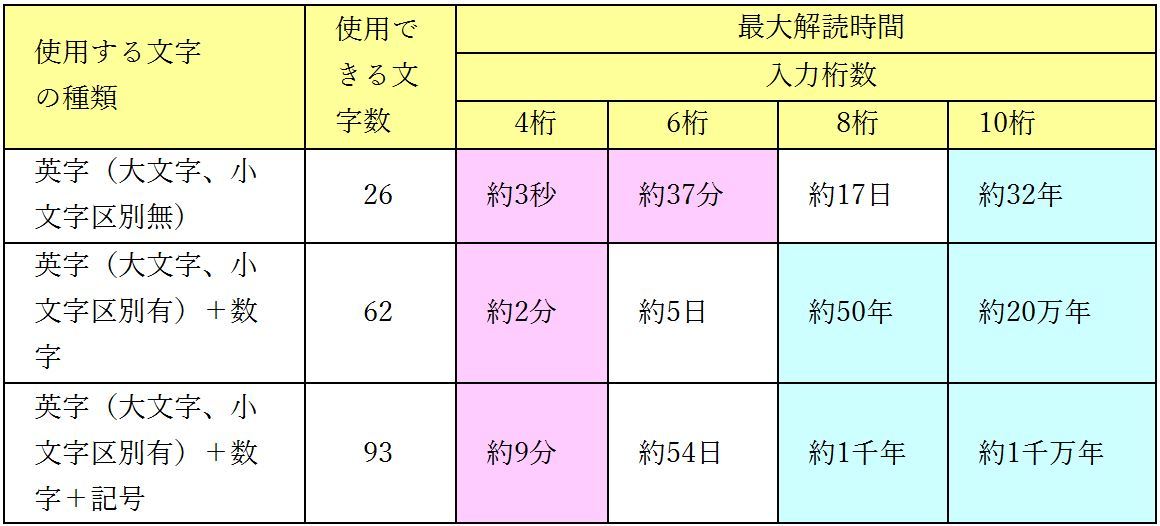 私もかつて情報処理推進機構(IPA)のセキュリティセンター長をしていたので、そのようなPWの不便さに合理的な理由があることは分かります(下表参照)。4桁の英字のPWだとパソコンを使用した総当たり攻撃(Brute
