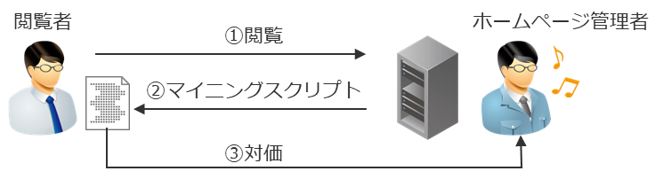 ホームページ管理者が意図的にマイニングスクリプトを埋め込んだコンテンツを作成することで、閲覧者にマイニング行為をさせることができます。それにより、閲覧者のコンピュータリソースを閲覧中のみ使用します。一般的にどの程度の処理能力を使用するかは、ほぼ気づかないあるいは若干処理が重くなった程度から、他の処理が実行できなくなるくらいの負荷を掛けることまで、ホームページ管理者側で設定が可能です。この事例は、ホームページ管理者が閲覧者にマイニングさせることで、新たな収入源を得ることができると言えます。一方で閲覧者への同意の取り方などについて、適切な方法に関する議論がされている段階です。しかしながら、こうした行為そのものに否定的な見解が多いようです。