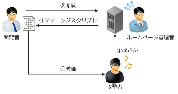 ホームページにマイニングスクリプトが埋め込まれ、それを閲覧者に実行させるところまでは項1.1と同様ですが、それがホームページ管理者の意図したものではなく、攻撃者によるものである点が異なります。改ざんは不正アクセスなどの違法行為を伴って行われている可能性が高く、その他どのような悪性コードが埋め込まれているかわからないという点でもこの行為はホームページ管理者にも閲覧者にも悪影響を与えると判断できます。