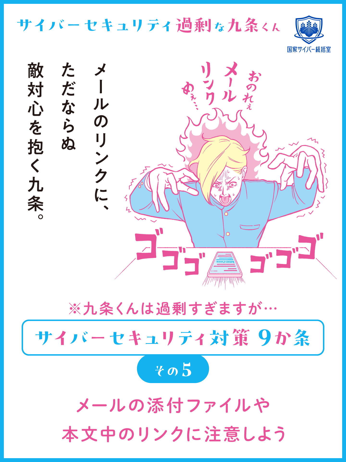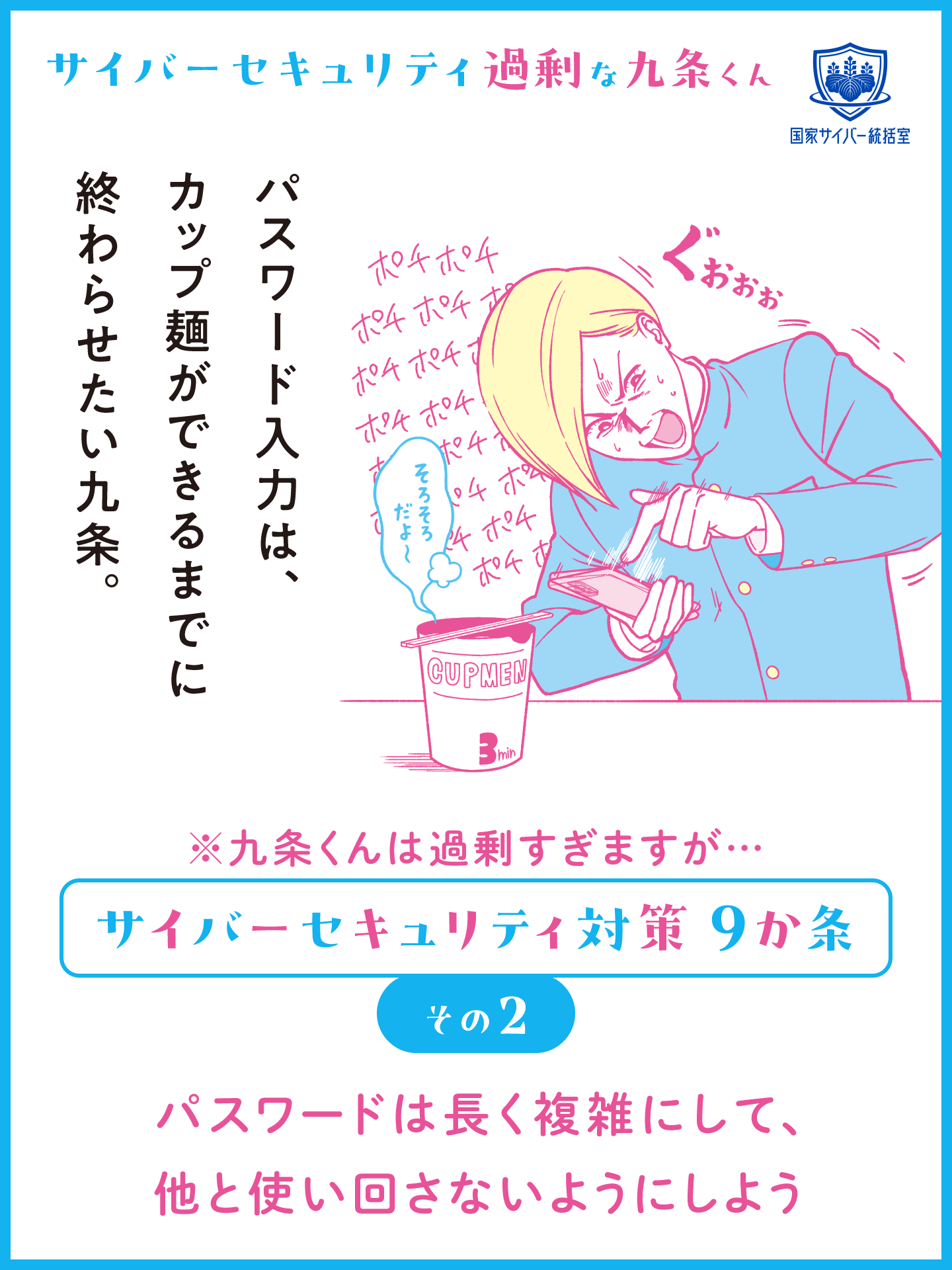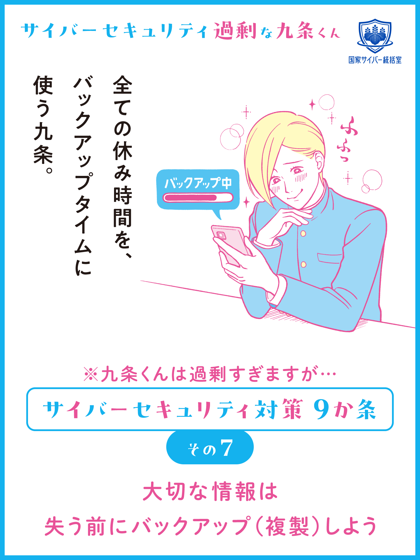サイバーセキュリティ対策に過剰に取り組む九条くんと一緒にサイバーセキュリティ対策を学ぼう! サイバーセキュリティ過剰な九条くんの動画の他に、SNSの発信などにご活用いただける画像コンテンツも用意しております。