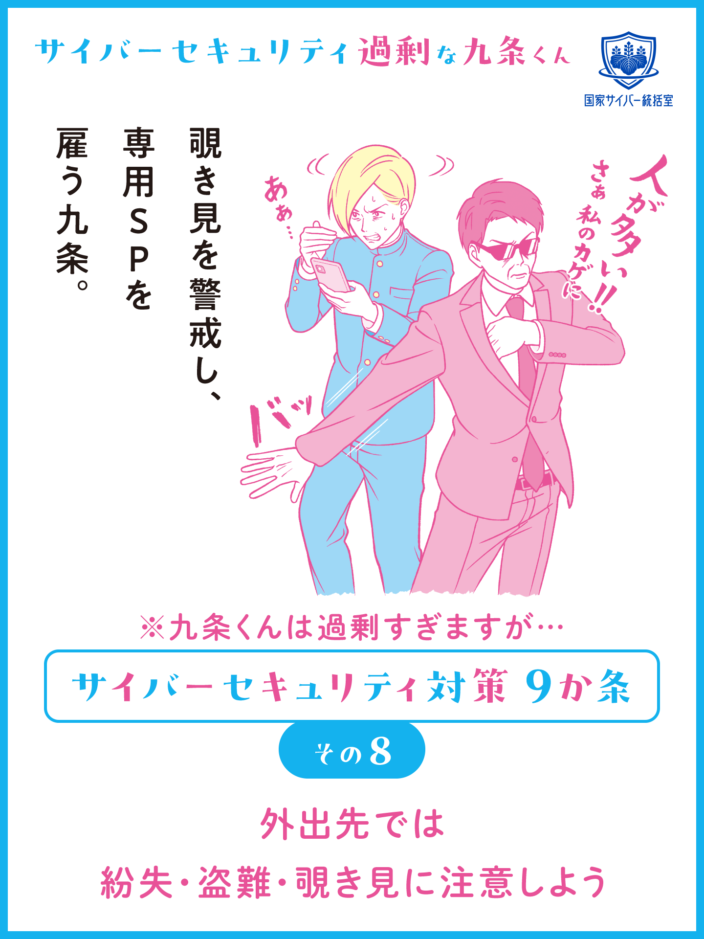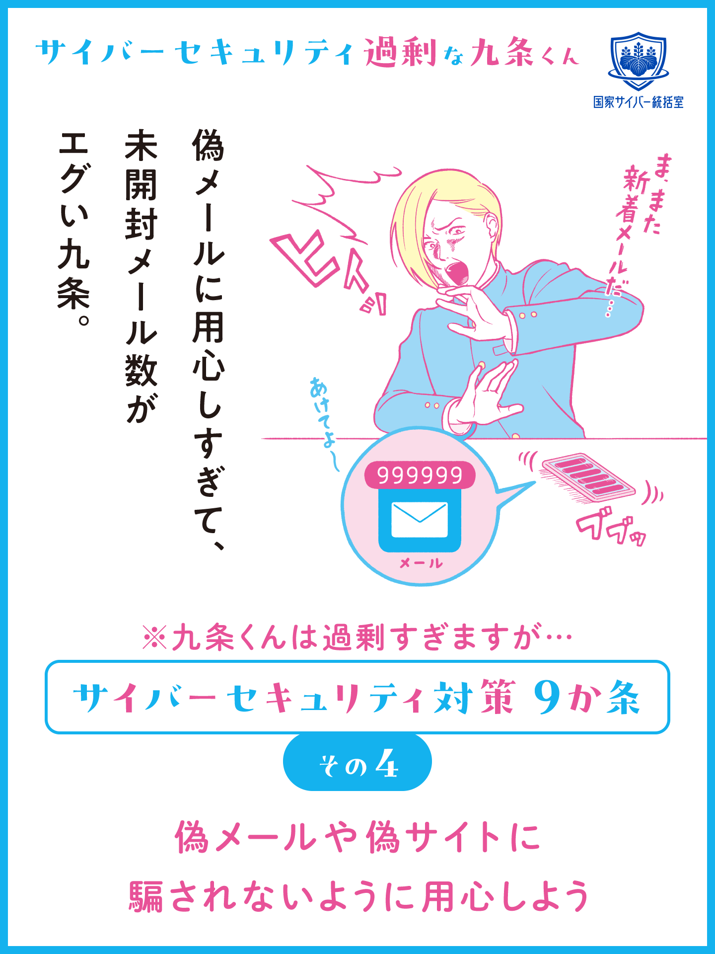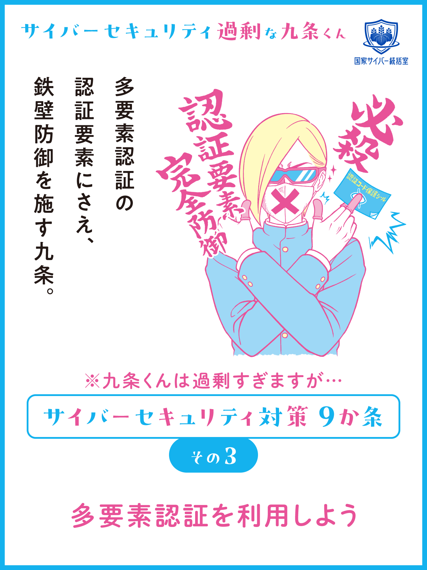 サイバーセキュリティ対策に過剰に取り組む九条くんと一緒にサイバーセキュリティ対策を学ぼう! サイバーセキュリティ過剰な九条くんの動画の他に、SNSの発信などにご活用いただける画像コンテンツも用意しております。