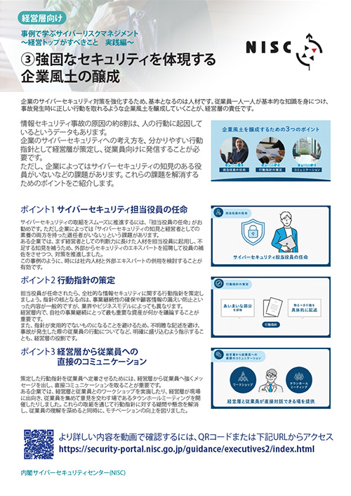 企業のサイバーセキュリティ対策を強化するため、基本となるのは人材です。従業員一人一人が基本的な知識を身につけ、事故発生時に正しい行動を取れるような企業風土を醸成していくことが、経営層の責任です。