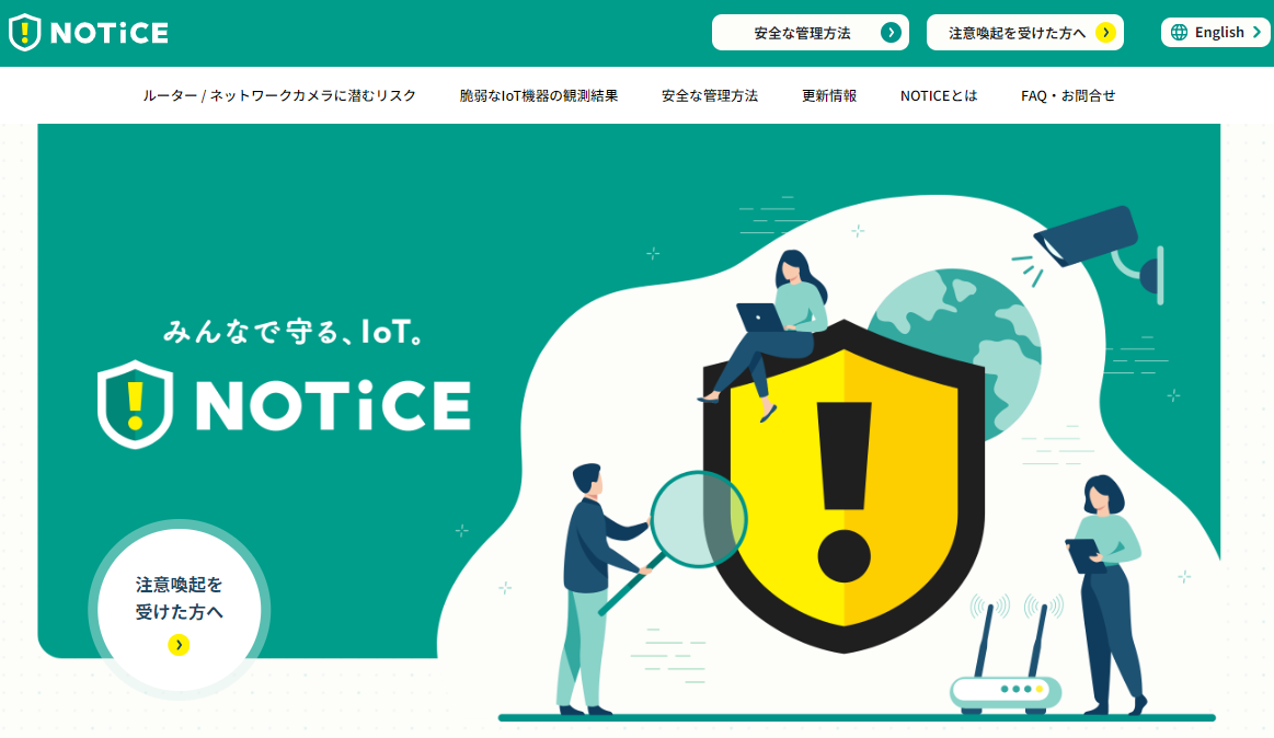 国立研究開発法人情報通信研究機構(NICT)によるサイバー攻撃及びサイバー攻撃に悪用されうる脆弱なIoT機器の調査を踏まえ、IoT機器管理者への注意喚起、様々な関係者との連携による対処の促進及びIoT機器のセキュリティ対策の周知啓発を行う取組です。